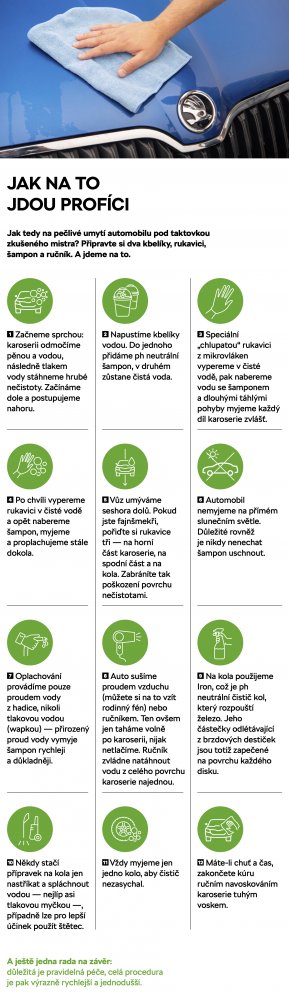 Když se rozhodnete dopřát svému plechovému miláčkovi pořádnou ruční lázeň, nejspíš sáhnete po dvojici houba + kyblík s vodou a šamponem, který najdete v garáži. To je první chyba, jakákoli houba je nepřijatelná, laku vozu rozhodně nesvědčí. A klasické staré šampony už také nedávají to, co moderní laky potřebují. Dnes se kosmetika vyrábí s neutrálním pH a například šampony v sobě mají složky, které látce pomáhají klouzat po povrchu laku a nepoškodí ho.